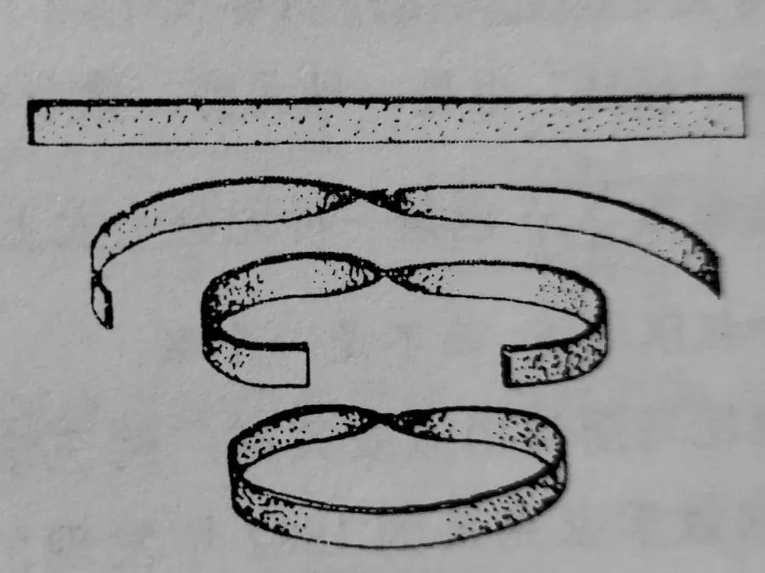 把一条长的矩形纸带扭转180°后,再把两端粘起来,这就成了一个仅有一个侧面的曲面(无正反面),它被人们称为莫比乌斯带,由德国数学、天文学家莫比乌斯在1858年发现。