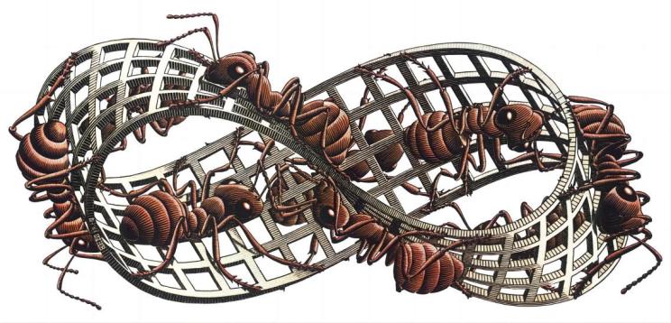 埃舍尔《默比乌斯带II》 (1963),作品展示的是一只倒霉的蚂蚁在环上无休止地爬行。