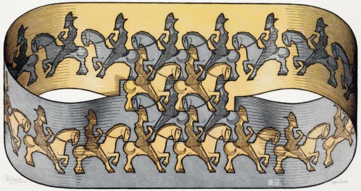 莫比乌斯带奇妙的性质引起许多艺术家的兴趣,最有代表性的就是荷兰画家埃舍尔(Maurits Cornelis Escher,1898-1972)了。