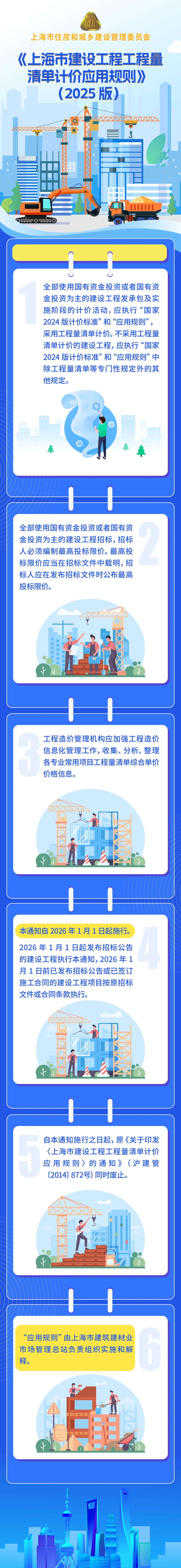 为深入贯彻落实《中华人民共和国民法典》《中华人民共和国建筑法》《中华人民共和国招标投标法》《建筑工程施工发包与承包计价管理办法》(住房城乡建设部令第16号)和《上海市建筑市场管理条例》等法律法规及文件精神,规范本市建设工程工程量清单计价行为,统一建设工程工程量清单编制原则和计价方法,依据《建设工程工程量清单计价标准》(GB/T50500-2024)、《房屋建筑与装饰工程工程量计算标准》(GB/T50854—2024)、《通用安装工程工程量计算标准》(GB/T50856-2024)、《市政工程工程量计算标准》(GB/T50857-2024)、《园林绿化工程工程量计算标准》(GB/T50858-2024)、《城市轨道交通工程工程量计算标准》(GB/T50861-2024)等国家专业计算规范标准(以下简称“国家2024版计价标准”),结合本市实际情况,市住房城乡建设管理委组织编制了《上海市建设工程工程量清单计价应用规则》(2025版)(以下简称“应用规则”),自2026年1月1日起施行。详见图解↓