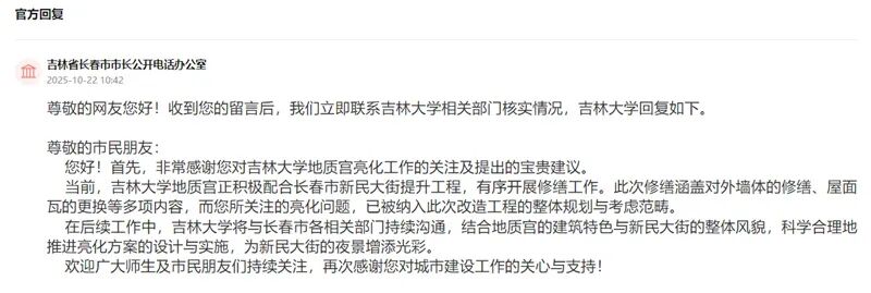 接到网友留言后,长春市立即联系了地质宫所属的吉林大学相关部门核实情况,并对网友的建议进行了回复:“您所关注的亮化问题,已被纳入此次改造工程的整体规划与考虑范畴。”
